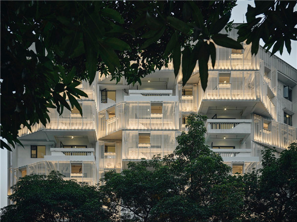 设计尽可能地保留了建筑中的原有结构,并且保留原建筑中以各层不同户型相连、房间面前的错层通廊和楼梯立体围合、汇聚在中心庭院这三重从私密到公共的空间层次。沿街裙房与住户之间的夹层填充健身房、视听室等公共活动空间,顶层露台设置观景、晾晒等休闲区域。同时在入口处增设了可以便利到达各楼层的观光电梯。