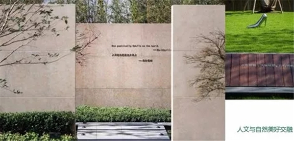 整个项目的风格是打造一个比较简约的空间,而且湖区给人一种宁静、恬静的感觉,所以我们的设计手法是非常克制的,没有过于强烈的装饰。入口的景墙有三个作用——夜晚的照明、空间界定、体现整个社区的品质,整个景墙是以一个雕塑的形象呈现的,把水的涟漪用一种比较抽象的方式表现出来。我认为在社区里应该有一些小小的、让人心动的地方,让人们能够在不经意之间感受到生活的美好。将一些小小的、有趣的元素点缀在景观中,精选一首小诗放在某一个地方,通过文化和景观的融合让人感觉到比较美好的现实生活。在这个项目中,我们希望人从城市到社区,能够真正静下心来,忘掉工作时的喧嚣,忘掉我们必须面对的复杂世界,感受片刻的宁静,感受生活的美好。表现的形式并不需要多么与众不同,而是要有非常恰到好处的表达,这是我对设计的一种理解。