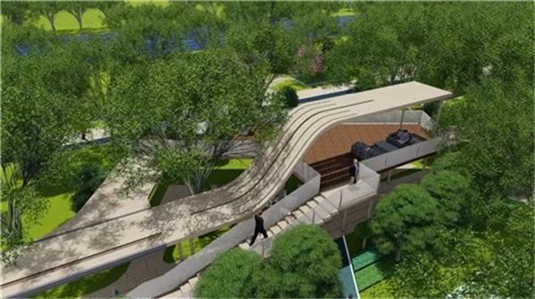 中海·上华琚这个项目的面积很小,大概1万多平方米。这个区域很小,但是周围的环境很复杂,如何能让居民在社区中惬意地生活,不感到拥挤,是我们需要去解决的问题。这个项目应用了一种流动飘带的形式来创造一个立体景观空间。我们将连廊的平面和立面设计成弯曲的,使其像一个环形的飘带飘在整个丛林之中,这样就在户外形成了非常丰富的、立体的户外活动交往空间。这个项目不具备让人们可以放飞自我的、可以尽情奔跑的空间,所以它更需要一些有趣的内容。立体的设计手法可以让人们在空中打招呼,这是很有意思的感觉,会形成很多空中的、人可以停留享受户外空间的场景。我们希望通过立体的不同层级的户外体验空间,能够帮助业主解决掉实际使用中会发生的一些问题,而且整个空间在丛林里,为人们活动提供了足够的绿量。