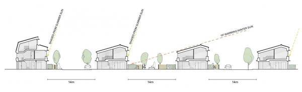 这一设计简洁地布置了四列共七栋建筑。精心设计的窗户可以最大程度方便居民日常生活。不对称的屋顶轮廓也使街道得到日照,使人们能够接受街区建筑之间14米的街道宽度。