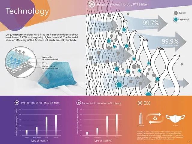 台北科技口罩获得2017年德国iF奖,采用独特的纳米技术聚四氟乙烯PTFE过滤器,使口罩过滤效率接近99.7%,过滤质量高于N95。细菌过滤效率为99.9%,这将真正保护我们的身体。
