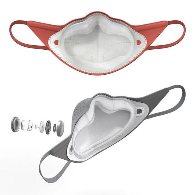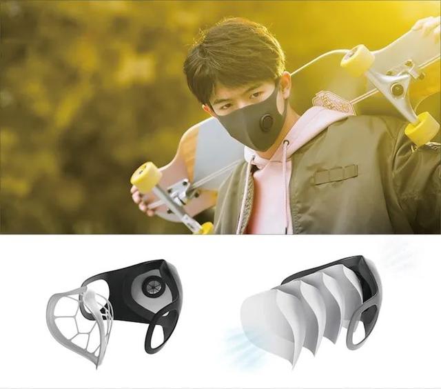 口罩采用双层设计:外层采用透气、轻质、优质的材料,采用三维模具热成型的形式来支撑结构,以达到更舒适的佩戴效果。此外,在外层有一个阀门设计,保持单向通风,确保更顺畅的呼吸。