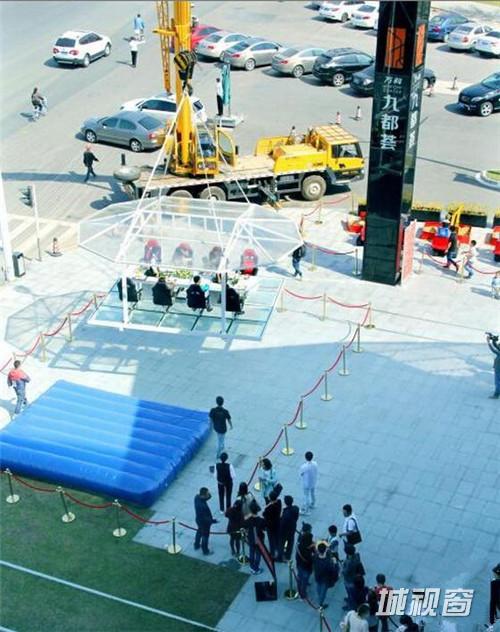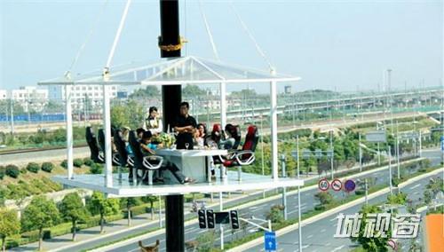 近年来,为了吸引消费,商家总会想出各种创意。近日,江苏南京一开发商推空中悬浮餐厅,吸引众人围观。该空中悬浮餐厅是开放式的,没有墙壁围栏,地板是透明玻璃,座位有安全带维系,可满载8位食客和两位服务生,由一辆重型吊车将其升至20米的高空中,停留15分钟左右,市民可一边品尝点心饮料、一边居高临下浏览美景,这一切都是开发商免费提供。这考验食客的勇气和胆量的空中餐厅,吸引了众多市民前来体验悬空20米高品美食看美景的感觉。