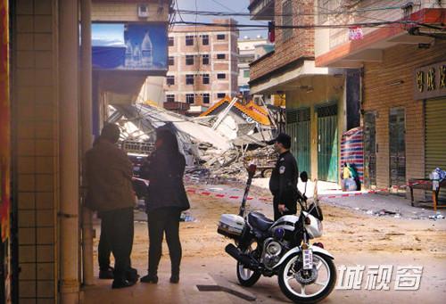 只听“砰”的一声巨响,一座在建的六层高楼房,瞬时倾塌。原本20来米高的建筑,塌方成3米多高。昨日上午9时许,出事楼房原本是一栋两层楼的住宅,东面是一个水池,北面紧挨着一个祠堂,南面是一个小型肉菜市场,房屋向东面水池倾塌,脚手架散落一地,部分废墟压在了水池上,原本150平方米左右的楼房,坍塌后废墟足有200多平方米,坍塌的力度将西面邻居家的一扇墙面也带倒了。