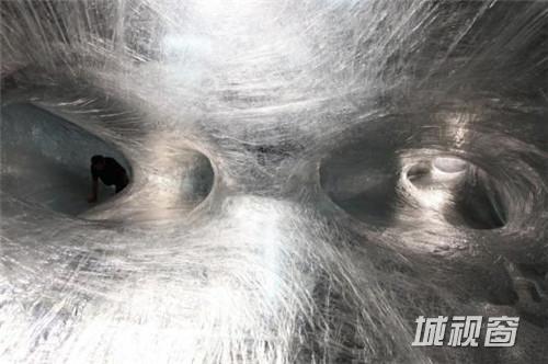 12个人花了10天时间,利用成千上万条交织的透明胶带在巴黎东京宫的大厅上方拉出一个悬空6米,跨度约50米的半透明迷宫通道。这个张力十足的装置是“Inside”展览其中一项内容,设计师希望在建筑内部植入一个有着光滑内部的有机体,与建筑发生对抗。