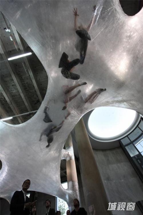 胶带在空中交织,生成复杂和不定形的表面,其灵感来源于随着舞者而动,记录舞者行为路径的舞带。而当这一概念向建筑学方向发展时,却变成了一维到二维再到多维的进化。如同寄生物存在于建筑中的有机形体装置内部柔软,有弹性,是力的均衡之美的产物。当你进入,这个从外看相当科幻有机的艺术品便又化为一个建筑空间。