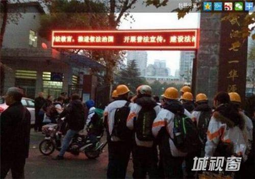 这张照片显示,有9名学生头戴安全帽向校内走去。校门口的立柱上,刻有武汉七一华源中学校牌。随照片有网友“af9933”发的一篇长帖,称自己是武汉七一华源中学初三学生家长,说与学校相邻的工地11月28日破土动工,拟建两栋99米、95米高的大楼。一旦工程开工向下深挖,校舍将是“危崖边的教室”。