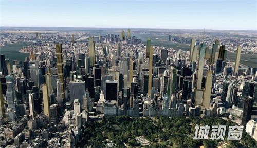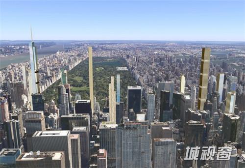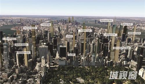 在中城区上空向北看,可以看到中央公园和沿着“亿万富翁大道”规划的超高层大楼们。