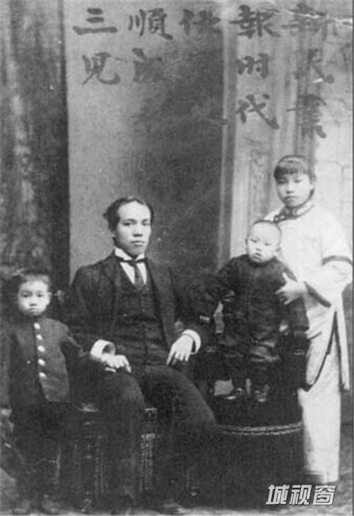 1906年,梁思成(左)与父梁启超、弟、姐合影,摄于日本东京。