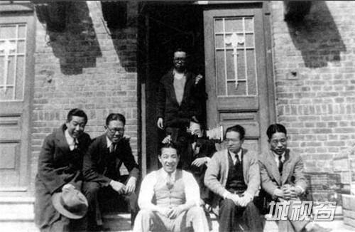 1929年,梁思成(右二)与付鹰、陈植、蔡方阴、徐宗碠等在东北大学教工宿舍前合影。