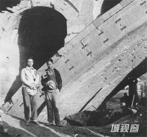 1933年,梁思成与莫宗江(右)测绘赵县安济桥时留影。