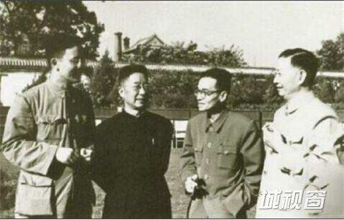 梁思成(左三)与华罗庚(左一)、老舍(左二) 、梅兰芳(右一)合影。