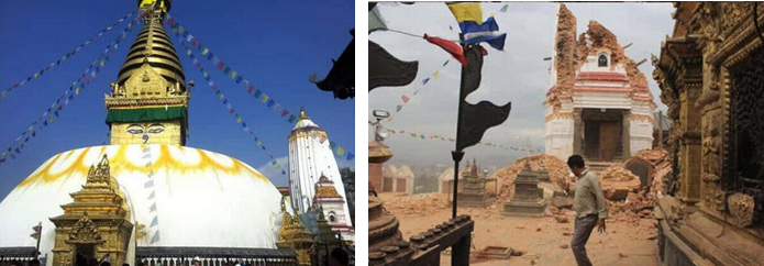 位置:加德满都城区损毁程度:主体建筑轻微受损,周围副塔坍塌