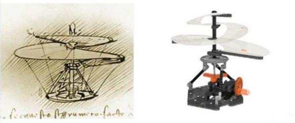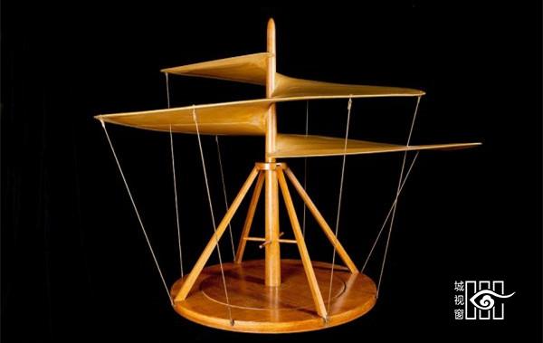 这种螺旋桨飞行器是达芬奇于1493年设计的,被认为人类第一次垂直飞行设想,是现代直升机的灵感来源。达芬奇设计需要用4.5米宽的帆布螺旋桨,而这个玩具只需要25厘米,安装有一系列的齿轮,并用手动曲柄传动,使用了同样的力学原理。