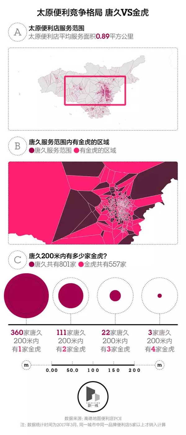 不过唐久和金虎之间不如芙蓉兴盛和快乐惠挨得那么近。在801家唐久中,你能在其中360家的200米范围内找到1家金虎,能在111家唐久的200米范围内找到2家金虎。