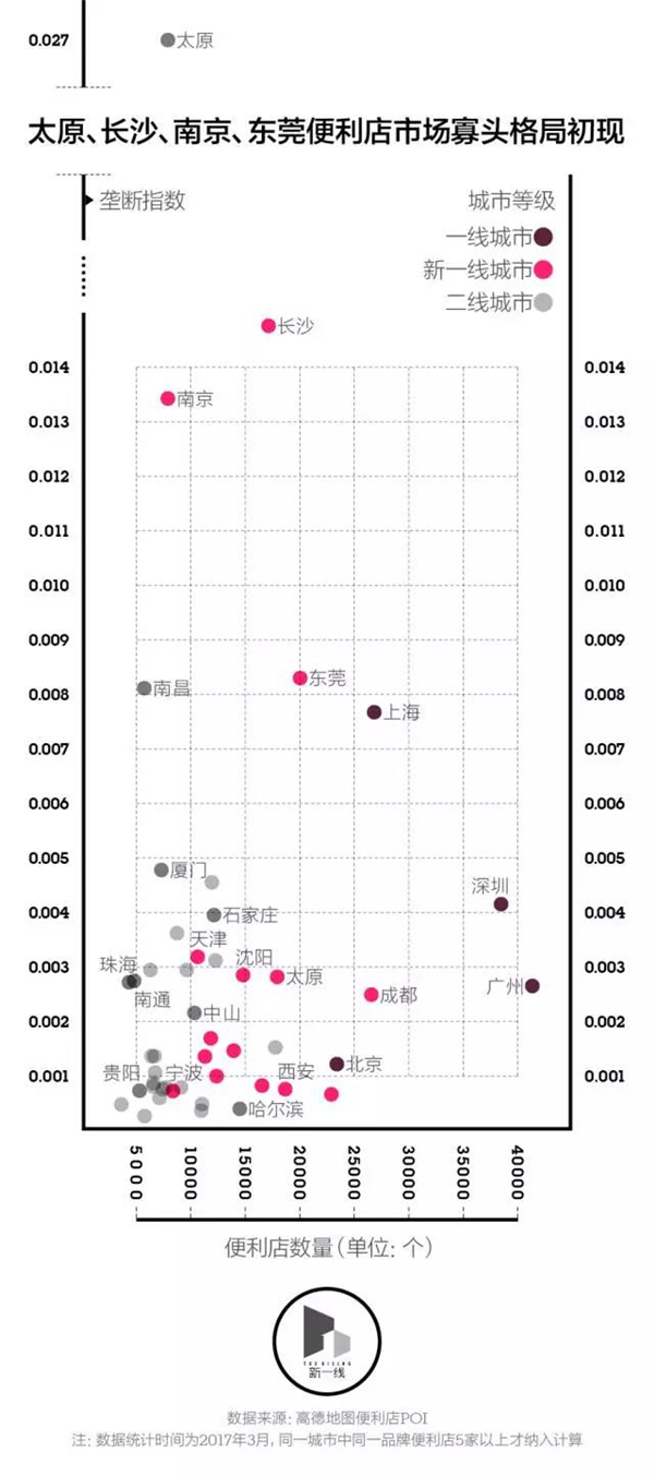 新一酱在计算之后得到的结果是,太原、长沙、南京、东莞的赫希曼指数排名前四,而人们印象中便利店多的上海和深圳,垄断指数并不高——这不难理解,沪深两城拥有更丰富的连锁便利店品牌。不过如果根据美国司法部利用赫希曼指数作为评估某一行业集中度的指标时定出的“>0.1为垄断”的标准,中国城市的便利店市场还都处在充分竞争之中。
