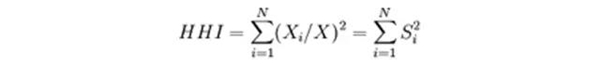 赫芬达尔—赫希曼指数,简称赫芬达尔指数,是一种测量产业集中度的综合指数,计算的是某一领域所有企业市场份额的平方和。你也可以将它理解为垄断指数,简单来说,指数越高市场集中度也越高,当市场处于完全垄断时,指数等于1。它的公式长这样: