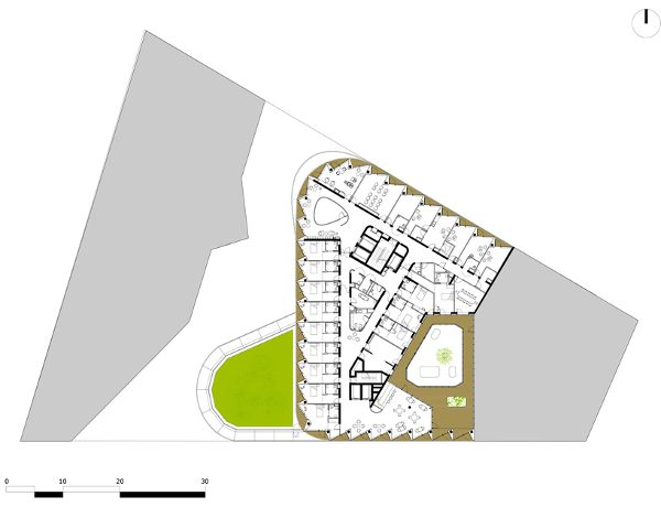 养老院位于街区的正中心,使其居民住在了城市的中心地带,并从市中心的活力中获益。这种多面体的立面面向多个方向,可以欣赏到不少对角线方向的风景,但同时也保持着一种对空间的亲密感。与传统的老式老年住宅综合体相比,这个项目完全作为一个整体来设计:不只是建筑设计,也包括室内设计和家具设计。这些房间,无论是面对城市还是天井,都拥有一个户外空间,就连顶层也拥有舒适的卧室。日常生活的重心就是家里的餐厅,其战略位置与城市的空间和节奏协调一致,这是两个至关重要的功能。