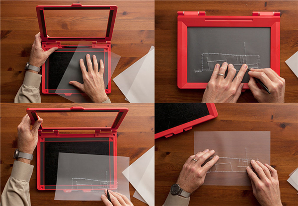 “随着专供盲人辨识物体使用的embossing printers 打印机和触觉绘图技术的运用,建筑图纸可以通过触摸来进行辨识。现在我正在与inTACT Sketchpad 的开发商一起合作,这样人们可以利用平板电脑通过手写笔在那些凸起的标记的指引下完成所需的信息。这些图形信息可以通过USB连接上传到计算机“。