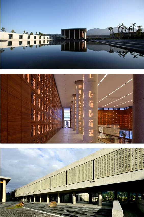 访客一开始先穿越两面高度不同的墙,作为与外头高速公路之间的缓冲;一进入道场,即能看到远方的主讲堂,静静伫立于80公尺长的荷花池中。超大柱廊在池中的倒影,伴随着飞扬其间的金色帘幔,自成一虚幻雅緻风光。主材料利用建筑混凝土,设计上尽量屏除华丽色彩与装饰,企图传达简朴的禅佛况味。大厅的下半部刻意运用透明设计,为上半部的木头“盒子”带来空悬于上的缥缈灵幻印象。