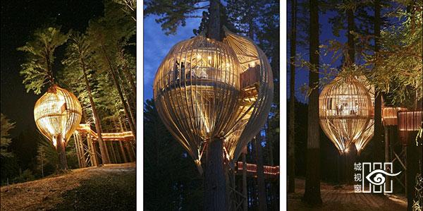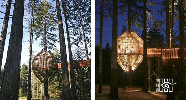 “红木树屋餐厅”的外观看上去如蝶蛹,附在树干上。