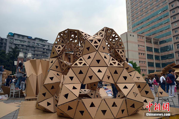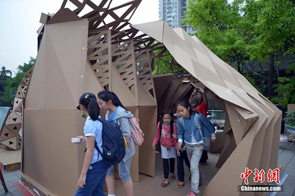 5月15日,重庆大学第二届纸板建造季在重庆大学B区举行,来自重庆大学和重庆5所中学的学子,在8个多小时里,搭出了近20座纸板屋。纸板屋的形状千奇百怪,怪兽、章鱼,变形金刚等造型。