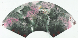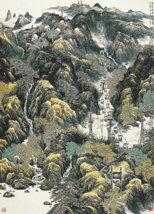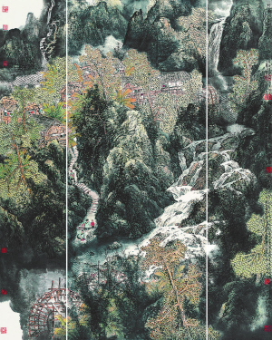 思考型的艺术家常常把自己对于人生的体验与思索注入绘画的笔墨之中,由此使他的作品不仅有其艺术力量,还具有理性的深度。画中强调了以书入画的“写意性”,笔力刚健,线以骨立,墨色苍润,云蒸霞蔚,色彩清新、鲜明而又雅丽,张建华创造了一种介于工写之间的山水画的新文本,已和传统的青绿山水、水墨山水拉开了距离,也在不同于今人的格法中脱颖而出。他的创造性在于,在突出以线造型的前提下,重视开发和利用运墨设色的过程中出现的随机妙幻的天趣,广泛吸收水墨画及其他现代绘画中可用之法,如积、撞、染、堆、冲、洗、擦等方法加强笔痕墨迹和制作肌理的可读性,增加平面色块的表现容量,提供更为丰富的视觉感受。更重要的是,画家在这一过程中摆脱了传统技法程式中按部就班的枯燥程式,增强了探索、发现、体现、调整、投入的乐趣,使画面真正成为一种具有创造意义的运动。