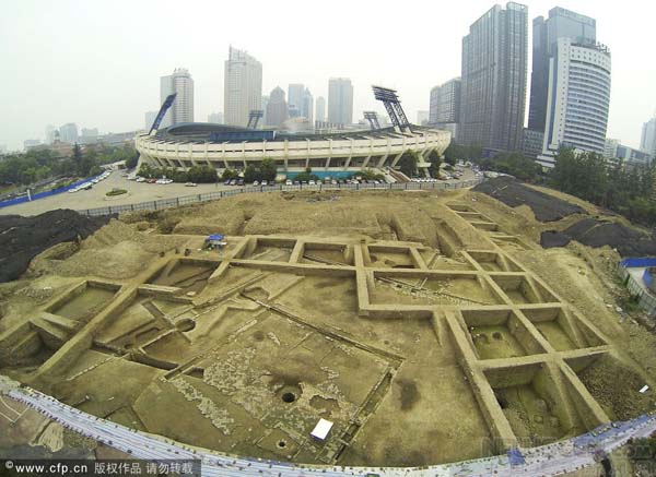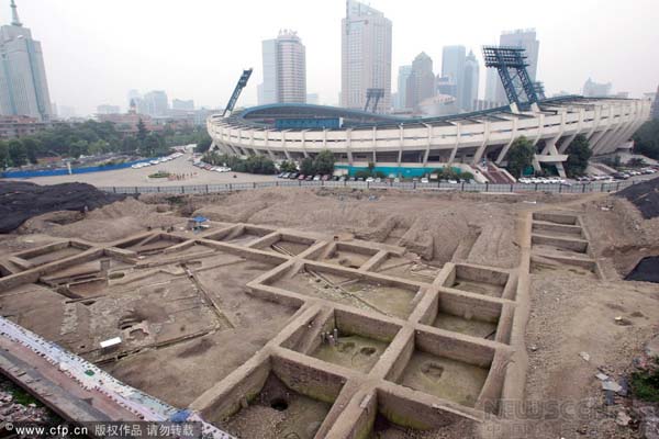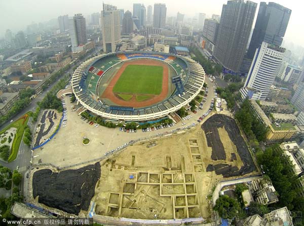 2014年5月22日,在成体中心考古工地,记者看到18个小型探方环绕着中央的一个巨型探方。其中有一面积超过100平方米、近似正方形的砖石天井,由于不能进入作业区,记者目测其边长10多米,一道明渠环绕天井的东北、东南、西北三面,而此前发掘出的散水小径和砖石路在天井的西北侧并列。值得注意的是,这方天井并不是规规矩矩地坐北朝南,南北中轴线向东偏转约23度,这与老成都城内的部分古街一致。