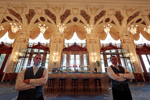 Barmen Damien Dellerba(左)和Sylvain Pastoret在赌场私人包厢内的吧台前。如今蒙特卡罗是世界三大赌场之一,1863年初建成时,这里十分简陋。1878年,勃朗兄弟接手以后,赌场被拆毁重建,多年赌场经营经验使他们强调赌场气派。