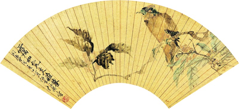 任颐 花鸟图 设色金笺 扇页1874年作