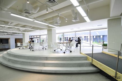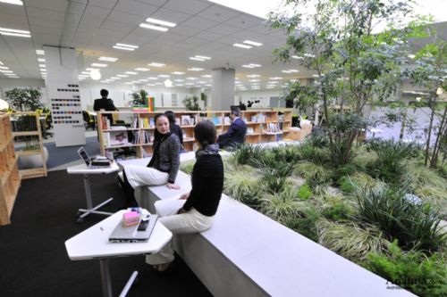 深处钢筋水泥中的员工,早已浑然不觉外面是风和日丽还是朦胧洗浴,也感受不到春风的舒爽,夏日的热浪,秋日的清爽和冬季的寒风,我们已经习惯于在高楼中穿梭忘却了大自然那最初的体验。然而在这里,KOKUYO东京品川办公楼5F,能体验环保办公的实验办公室里,安装自动感应装置的照明设备,根据屋外日光照度自动调节亮度呈现最自然的光;自动感应外界温度变化,可以自动开合的外窗、采用森林废材制作的会议桌、通过落地窗,外面花园尽收眼底,在工作的同时,时刻感受大自然的四季变化,在一年四季中与大自然融合。