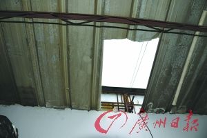 窃贼用剪刀剪出的铁皮天窗。