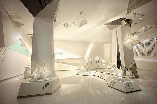 序厅的整体空间设计是一种变异的美术馆风格,易于展现整个项目的气质和水晶的独有特点。多棱面的空间装饰象征着水晶造型,同时运用大量不锈钢反射材料,体现水晶的魅力和能量感。