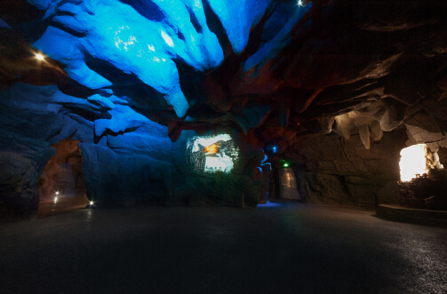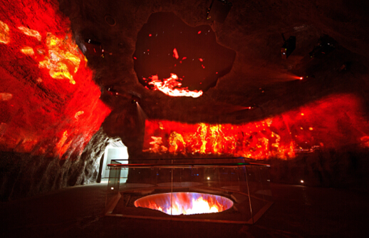 此区域主要强调的是体验感。因此设计者把世博会的主展形式和迪士尼乐园的相关展示手段共同融入了展区。同时,此区域与序厅风格形成了强烈反差,目的是打破参观者的固有思维,加深体验的感受,更利于对故事的理解和传播。此区域真实的还原了火山洞口场景。参观者围在火山口四周,可以看到岩坑中所讲述的水晶形成的故事,周围墙面与顶部的岩壁则配合演绎着水晶亿万年前的形成过程,整体氛围真实切震撼,有一种身临其境之感。演绎内容先是由顶部的宇宙大爆炸引出整个故事;继而来到四亿年前的地球,可以看到火山口内的熔岩熊熊燃烧,顶部烟云翻滚,四周墙面火光亮起;之后火山运动逐渐减弱消失,夜晚降临,顶部亮起点点繁星,同时在墙面上和火山口内可以看到熔岩物质冷却,形成了水晶晶体。