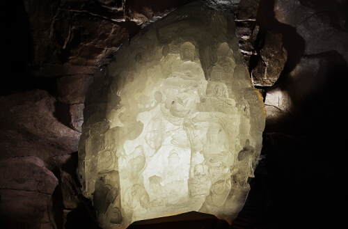 该区域的洞口的石梁上,讲述的是前世佛燃灯法师和释迦牟尼的故事。道出如佛经中说释迦牟尼佛成佛之前得燃灯佛受记,将在九十一劫后的贤劫成佛。进入山洞,整个展区还原了佛祖休息修行的山洞场景,墙上的影像内容是即将实现的过去的未来,其中有佛祖普渡众生的画面,他最终将水晶作为信物,保佑众生平安。整个画面均为版画效果,赋有历史感和年代感,简约而不简单。