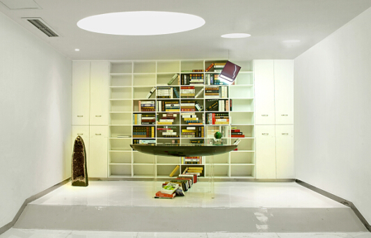 书房运用了超现实主义的视觉双关语设计手法:有形中见无形,无形中见有形,大形中见小形,小形中见大形。设计者以思考者为原型,通过书柜的图书、书桌、吊灯和台灯整合出思考者的整体造型,进而在保证基本展示内容的基础上使得整个书房更具艺术气息。此区的展品为紫水晶,具有开发智力,帮助思考,集中注意力,增强记忆力,促进脑细胞活动的功效,非常适合放置于书房。