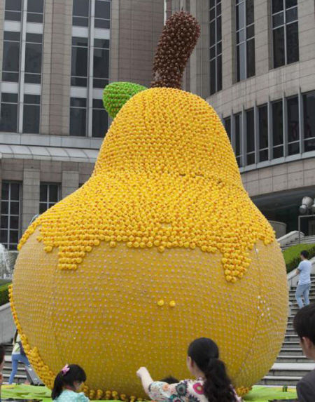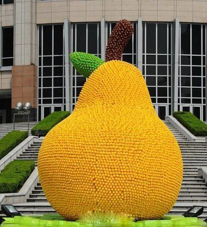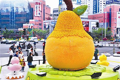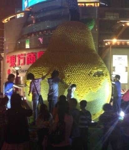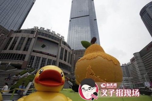 港汇广场门口的大鸭梨上,小黄鸭被拔去大半