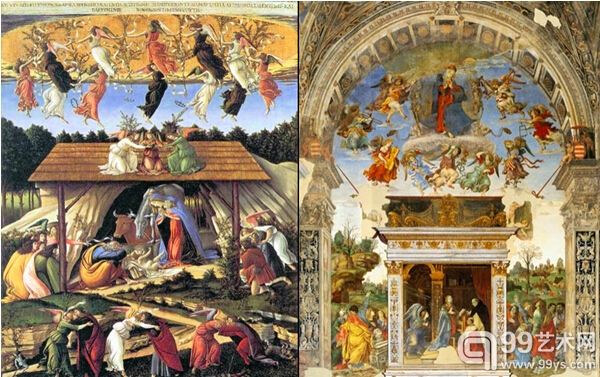如果说,波提切利在这幅《耶稣降生》的小画中,用茅草屋框出并嫁接了的圣母耶稣与舞蹈天使上下两个空间,那么利皮则在这个空间切割的范本上又加入一层神学意义的时间重叠。于是框内发生的《天使报喜》预示着框内圣母的升天,框外的人物就像波提切利画中前来目睹耶稣降生的天使们,讶异地看着、做着手势。他们既是框内道成肉身场景的观众,也是圣母升天神迹的目击者。