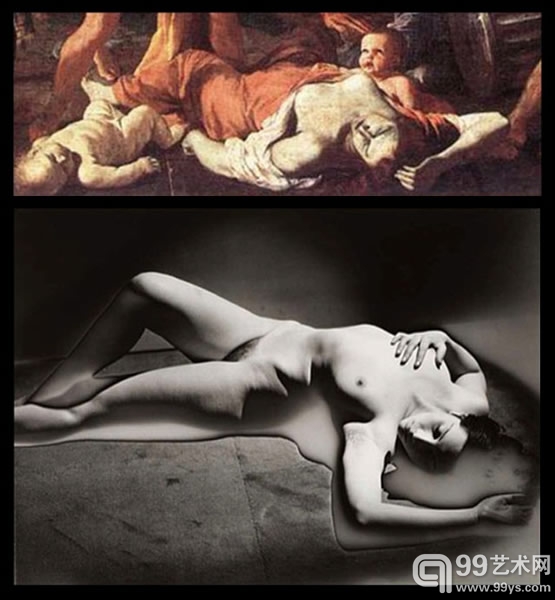 曼·雷的作品像是对普桑画作的放大与特写,他截取了这幅画中对古典构图和叙事最具颠覆性的细节,他重新发现了普桑画作中酒神式的癫狂,以及一个非古典、非传统的超现实普桑。或许也只有这样,我们才能更好的意识到普桑对这具身体处理中根本的扭曲,意识到其实在曼·雷摄影中看似新奇的摄影特效,其实早在普桑画中母亲身上那块残暴光影中,就已经被开创。