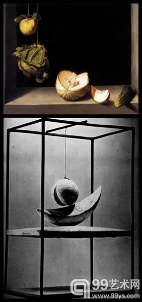 不论是杜尚现成品之后的现代雕塑,还是十七世纪黄金时期的静物画,进入艺术的物都成了魔法的载体。特别是当把超现实主义时期的贾科美蒂(Alberto Giacometti)与西班牙巴洛克时期的静物画家胡安·桑切斯·科坦(Juan Sánchez Cotán)放在一起时,我们会发现,他们的形式与空间感接近得令人惊讶。