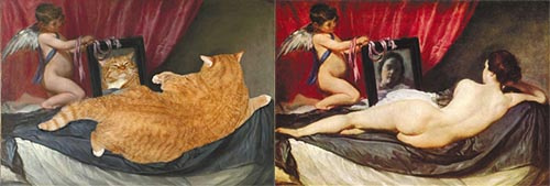 西班牙画家迭戈·委拉斯凯兹的作品《镜前的维纳斯》变成了查拉图斯特拉这只猫对镜梳妆了。