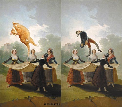 西班牙艺术家弗朗西斯科·戈雅的画作《稻草人》被佩特洛娃改名为《弗朗西斯科·戈雅,忘记稻草人,还是和猫玩更有趣》。