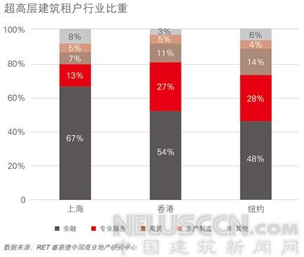 在针对纽约、上海、香港的超高层办公楼租户背景分析中,金融与专业服务业租用了超高层办公楼约80%的面积,为主力租户。