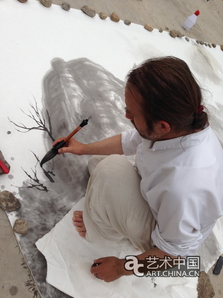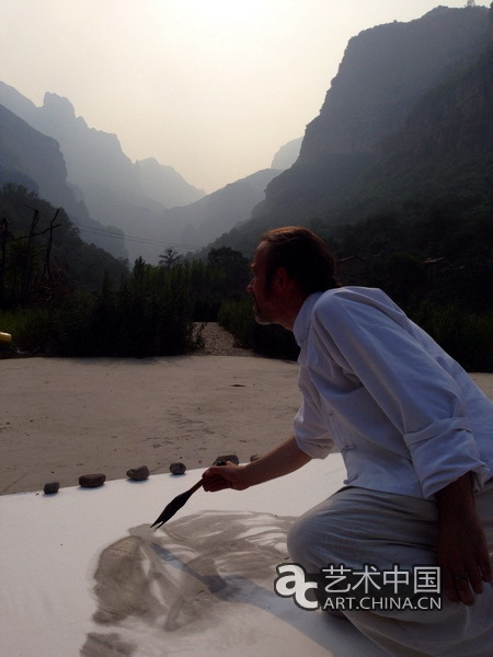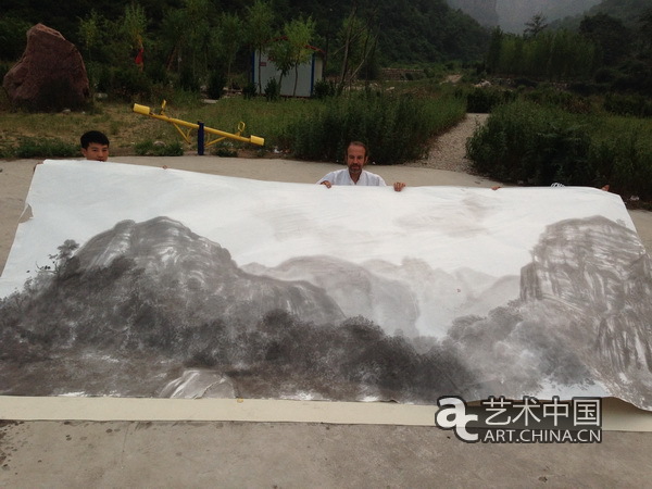 伊瑞选择了太行大峡谷旁边的一块较为平整的空地,在地上摆开了2米×4米的毛毡,赤脚在宣纸上作画,面对巨大的太行山,他将眼见之山搬到了这张巨大的宣纸上,从起笔到结束大概用了3个小时左右,最后一张完整的作品基本完成。正如他昨天所说,太行山不能用小尺幅来画,必须用大尺幅才能绘制出它的沉雄和博大。如此壮观的场面,不停的引来游人驻足观看。