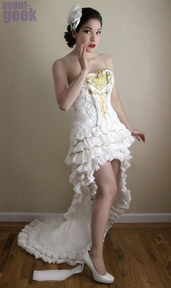 洁白的婚纱精致华美,层层裙摆上还点缀着朵朵玫瑰,惊艳无比。然而你绝对想不到,这件美丽的婚纱竟然是用厕纸做的!据美国猎奇网站“odditycentral.com”6月11日报道,来自美国北卡罗莱纳州的一名艺术系女大学生用11卷厕纸和胶水做出了这件独一无二的婚纱。