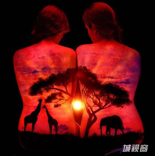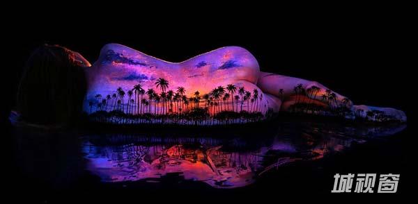 据《每日邮报》6月18日报道,美国加州艺术家John Poppleton用荧光材料将日落、海洋山脉、星夜等自然风景绘画在模特儿的皮肤上,同时把她的身体融入于自然题材之中,在黑暗中,利用荧光的淡紫色,橙色和绿色创作出一组令人叹为观止的艺术作品。
