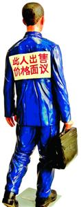 朱发东作品《此人出售》也引发议论。艺术家以本人为原型进行创作,其人像身穿一件深蓝色中式制服,背部缝了一大块白色帆布,上面写着8个红色大字:“此人出售,价格面议”。