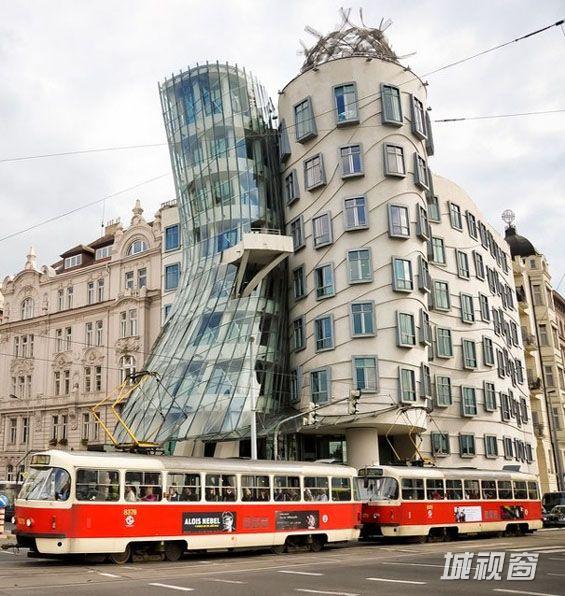 盖里的舞蹈大厦位于捷克共和国布拉格。这座建筑看上去就像一对正在跳舞的情侣,外形的弧线犹如伴随音乐飘扬的裙摆,使造型更加完美。