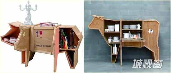《动物总动员》的能量你可不能忽视,意大利设计师Malerba 以货运的木箱制作动物形状的橱柜——“Sending Animals”,牛、猪、鹅不规则的动物造型,使橱柜跳脱方正的印象,不规则的美感以及探索如何收纳也是一种乐趣。更地道的是,橱柜上还贴有各式标语贴纸,比如代表放置朝上的红色杯子和“小心轻放”字样等,似乎预示着这批动物一直在旅途中的感觉,如果真的批量生产的话,这绝对是文青最爱。
