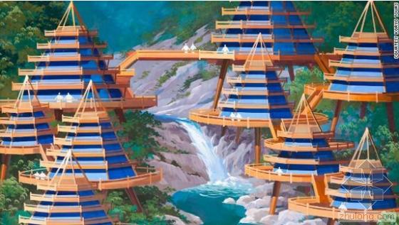 朝鲜金刚山地区,架设在瀑布周围的度假别墅群的效果图